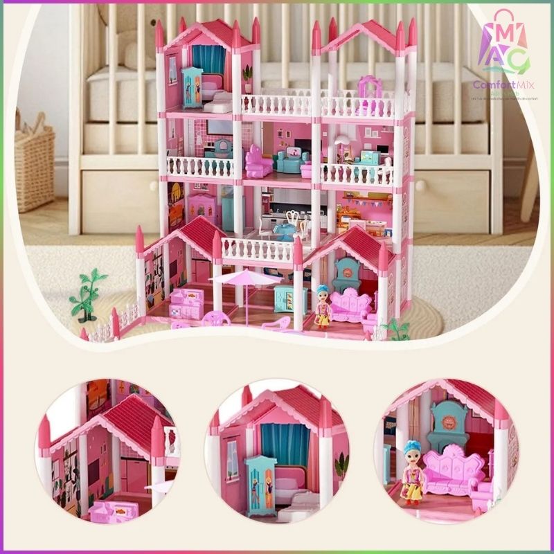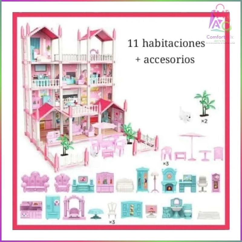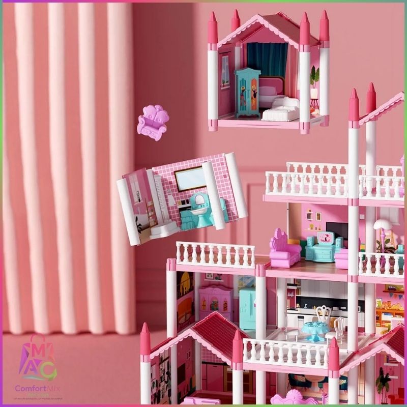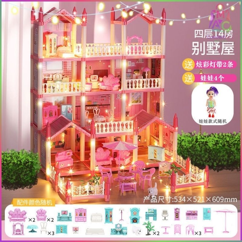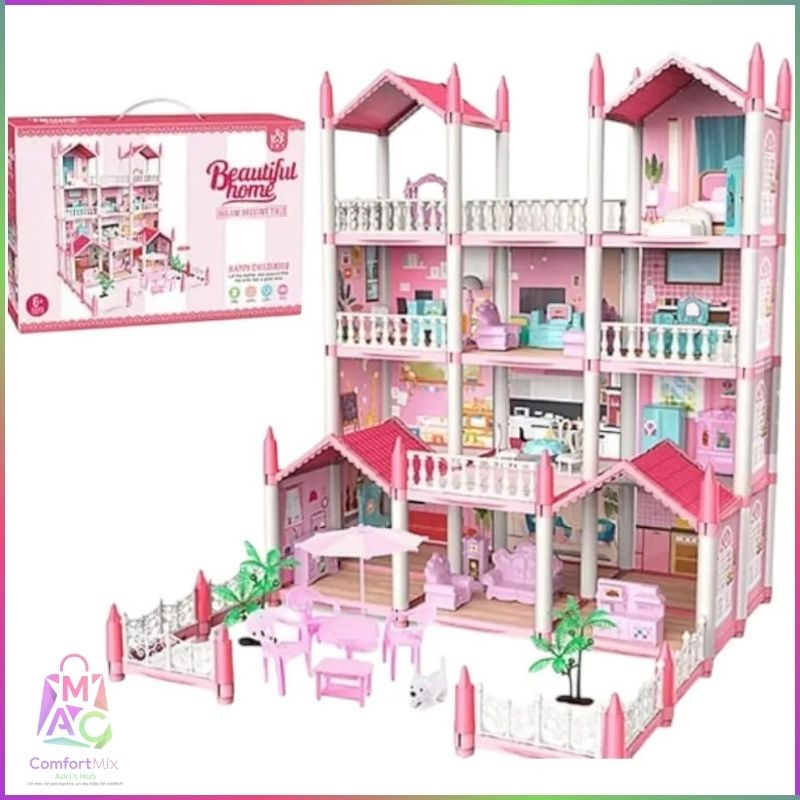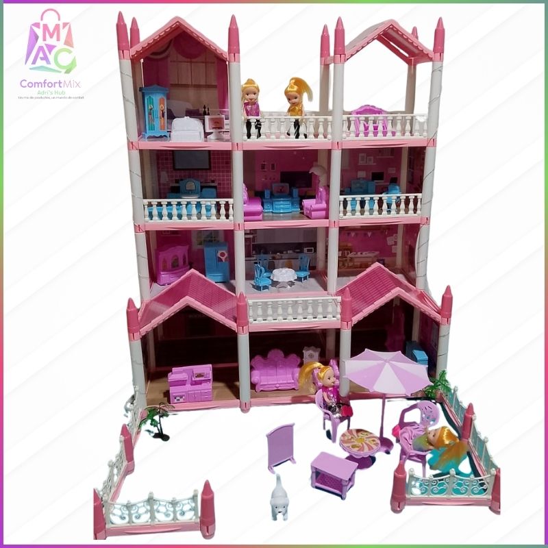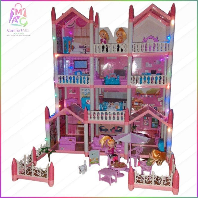 🏰💗 Casa de Muñecas Modelo 462-14 – 4 Pisos con Jardín, Luces, muñecas y Accesorios
